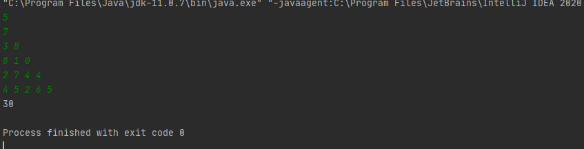 /* import ... */ import java.io.IOException; import java.util.Scanner; public class Main { public static void main(String[] args) throws IOException { int max = 0; Scanner sc = new Scanner(System.in); int n = sc.nextInt(); sc.nextLine(); if(n < 1 || n > 500) { System.out.println("잘못된 범위를 입력하셨습니다. (1<= n <= 500)"); return; } int[][] input = new int[n][]; int[][] dp = new int[n][]; for (int i = 0; i < n; i++) { input[i] = new int[i+1]; for (int j = 0; j < i+1; j++) { input[i][j] = sc.nextInt(); } sc.nextLine(); } dp[0] = new int[1]; dp[0][0] = input[0][0]; if(n == 1) { System.out.println(dp[0][0]); } else { int count = 0; for (int i = 1; i < n; i++) { dp[i] = new int[i*2]; for (int j = 0; j < i+1; j++) { if(j==0) { dp[i][j] = dp[i-1][j] + input[i][j]; } else if(j == i) { dp[i][j] = dp[i-1][j-1] + input[i][j]; } else { dp[i][j] = Math.max(dp[i-1][j] + input[i][j], dp[i-1][j-1] + input[i][j]); } // System.out.println(dp[i][j]); if(i == n-1 && max < dp[i][j]) { max = dp[i][j]; } } } } System.out.println(max); } }소스코드 : https://github.com/lsjjong8/Algorithm-Study/blob/master/0.%20WSAPT-Study/BOJ1932.java